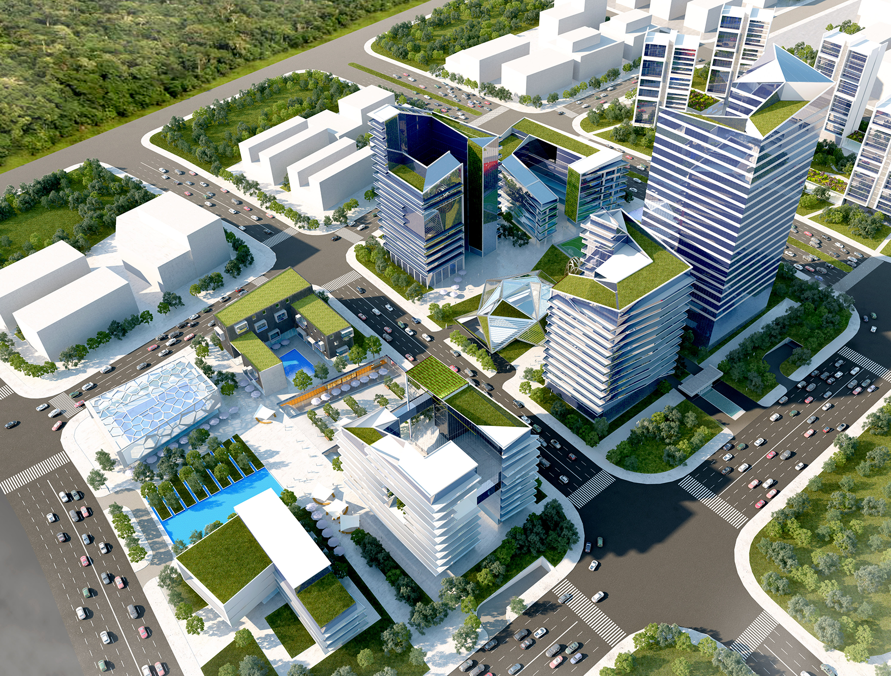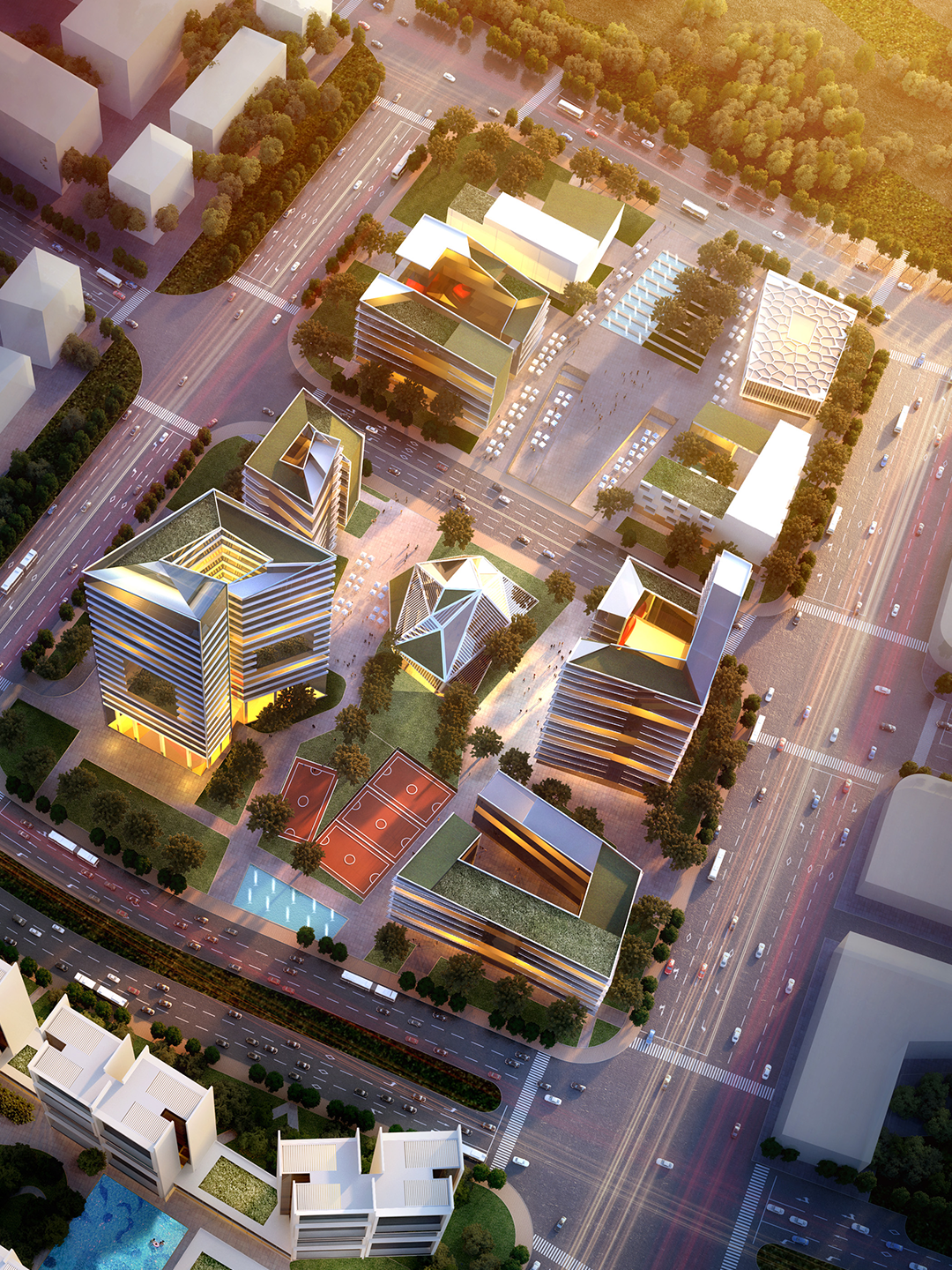The four office towers within the site vary in height in accordance with the planning height limits, and together they shape the skyline along the southern bank of Xinglong Lake.In addition to being interconnected underground via basements, the towers are linked by aerial footbridges, enhancing connectivity and interaction between the office buildings.
