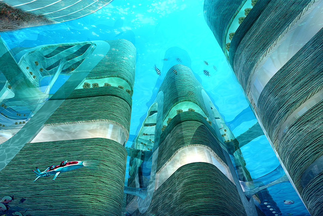 The underwater passages with roads and sidewalks provide lateral transportation and access channels between islands and buildings.