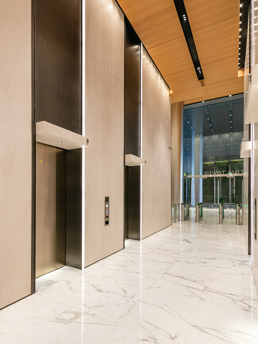 The lobby features high-quality materials including extra-grade Statuario white stone flooring, beige marble wall cladding, wood-grain ceilings, and warm-toned brushed stainless steel signage. The warm hue of the wood-grain ceiling brings humanity to the voluminous space and creates a striking presence that stands out prominently within the CBD.