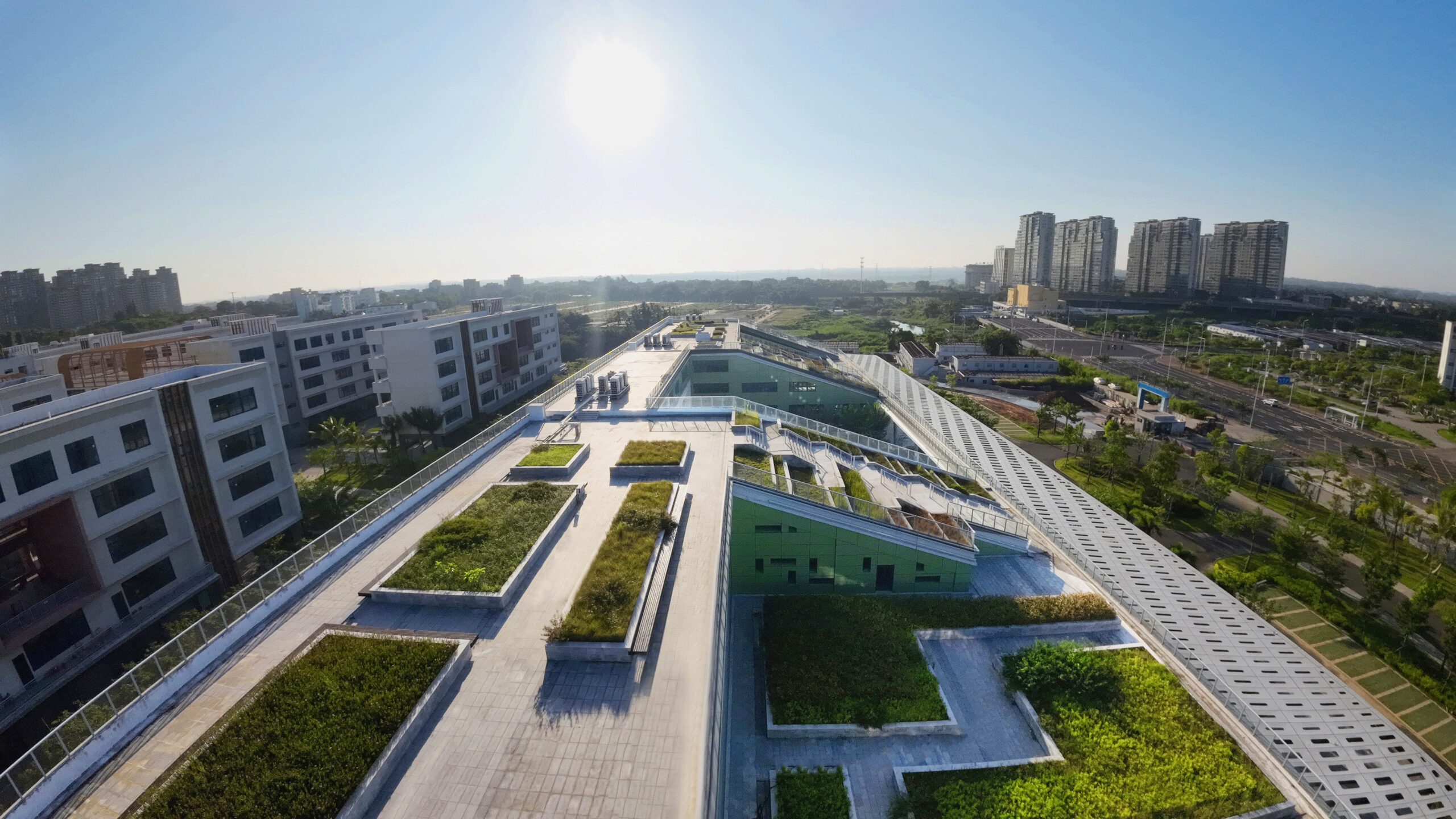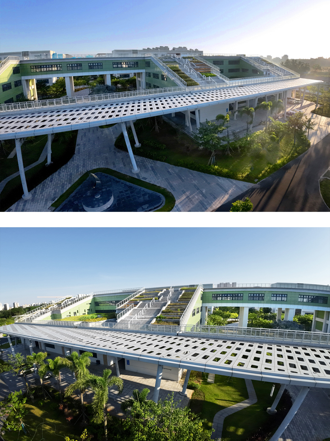 Responding to Hainan's intense sun and rainy season, the facade employs a self-shading strategy with recessed volumes. The multi-directional massing combined with this system creates a unique visual identity, extends the campus's sustainability ethos, and results in a passive, energy-efficient building adapted to local conditions.